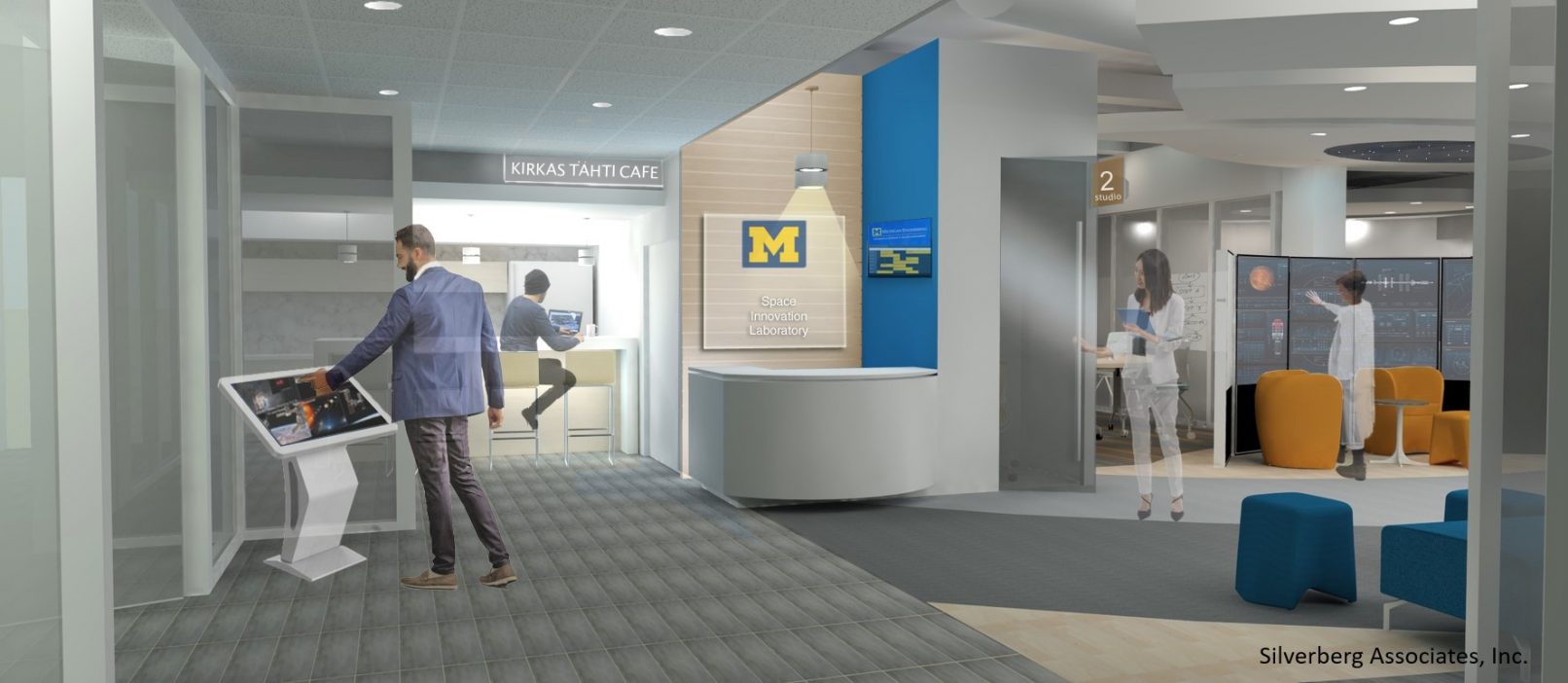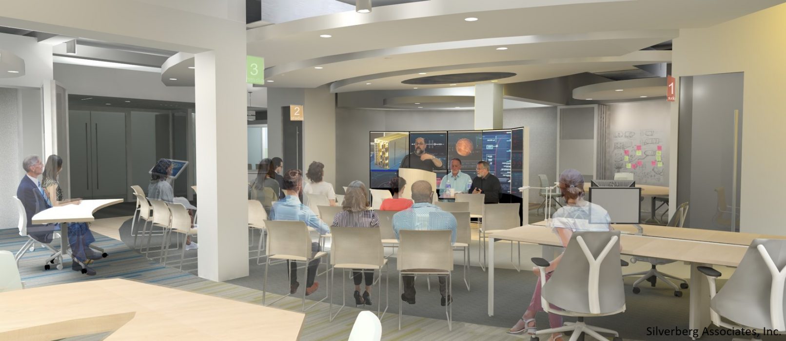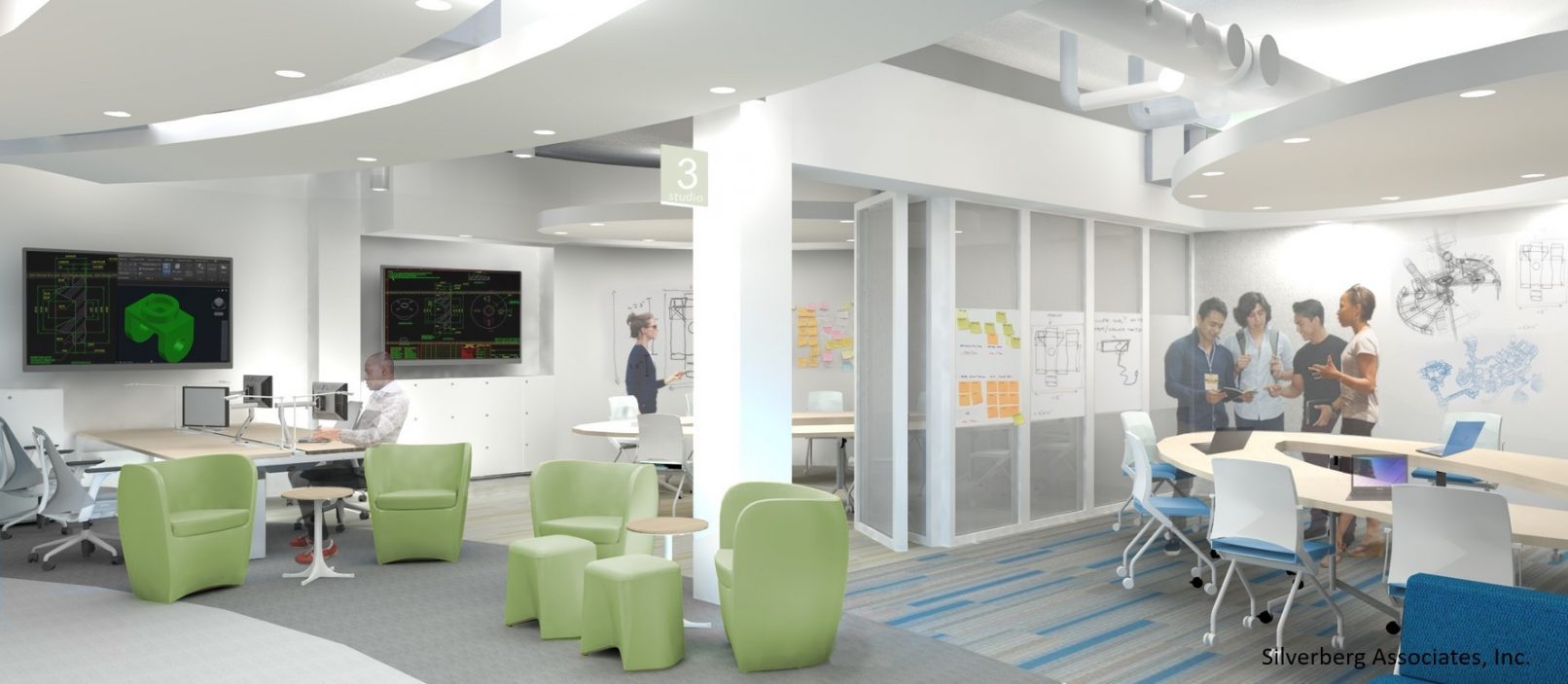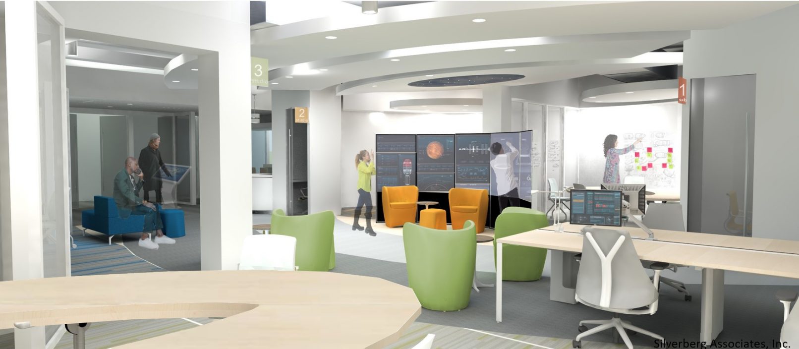 This 3,000 s.f. renovated space encompasses a unique environment in support of a collaborative process for the design of up-and-coming interplanetary spacecraft and their instruments.   The project’s program contemplated the question:  if one was to compose a completely flexible space that supports varying sized multi-disciplinary engineering teams, that both inspires and facilitates a creative problem-solving process – what would that environment look like?  How would it function?  How would this then be translated within the limitations of an existing space?  The resulting solution incorporates four varying sized teamwork-studios that can be opened or closed off from one another, clustered around a central gathering space.   Individual closed-door work pods are provided when quiet spaces are needed.   A sophisticated IT / interactive AV infrastructure interlinks the activities of the studios and the central space.   The central space can also be configured for impromptu lectures and TED-talks on various aspects of spacecraft design.  A café is provided in support of the teams’ and space’s activities.   The front entry area features interactive displays to inform visitors of upcoming activities, and outline the laboratory’s on-going projects and its interdisciplinary outreach efforts.   This same area can work in conjunction with the café to host special events (including watching spacecraft launches), receptions, and exhibits, when desired.